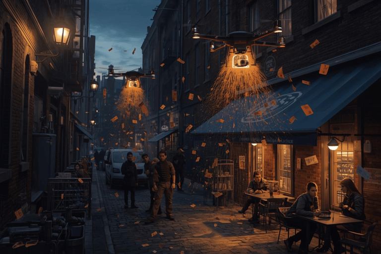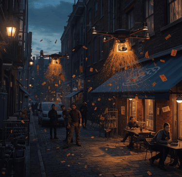 The Pumpkin Spice Campaign (PSC) elevates stealth with its high-tech tactic where activists deploy small, silent drones at dusk to hover over non-compliant cafes and stores, precisely dropping biodegradable packets of pumpkin spice flavoring, propaganda leaflets demanding year-round availability. This aerial subversion, inspired by covert delivery operations, allows participants to evade security while sowing seeds of flavor revolution from above, turning unsuspecting establishments into unwitting hubs of spice advocacy overnight. As the drones vanish into the night, the scattered evidence sparks curiosity and conversions among staff and patrons