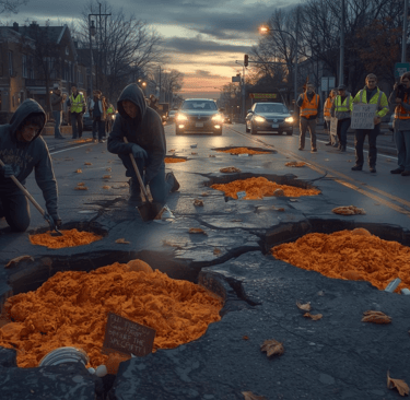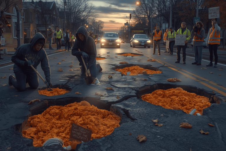 Stealthy teams of activists target neglected city streets at night, filling potholes with heaps of mashed organic pumpkins to symbolize the "flavor voids" left by seasonal scarcity in our daily lives. As dawn breaks, participants emerge with witty signs proclaiming "Fill the Spice Gap Before the Road Gap!" or "Seasonal Neglect Leaves Holes in Society," drawing honks of frustration from drivers and forcing municipal officials to dispatch repair crews who encounter our embedded messages and petitions tucked into the spiced filler. This guerrilla repair job not only highlights infrastructure woes but cleverly ties them to our cause, sparking media buzz and public discourse until authorities and businesses alike yield to demands for year-round pumpkin spice availability.