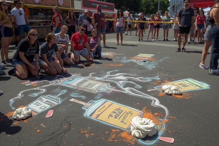The Pumpkin Spice Campaign (PSC) proudly unveils its "PS Crime Scenes" protest strategy, a clever and visually arresting tactic where activists covertly attend events, conferences, or festivals that fail to offer pumpkin spice offerings, swiftly drawing chalk outlines on the pavement or floors depicting spilled coffee cups with steam curls, whipped cream dollops, and scattered spice flecks, styled like forensic body outlines to symbolize the tragic "demise" of flavor freedom due to seasonal neglect. This ingenious approach, inspired by sidewalk chalk activism that has effectively spotlighted injustices through ephemeral art, ensures our cause leaves an indelible mark—wiped away only by rain or reluctant compliance